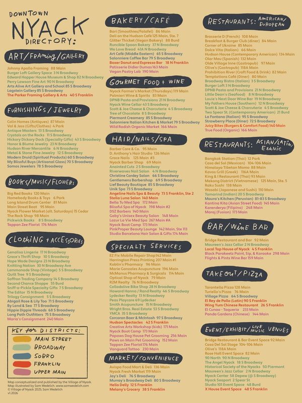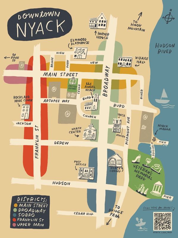 The Directory provides location and category information for over 150 Nyack businesses. Just look for the Category you're interested in and find it through the color-coding of the Business Districts. Or, use the color-coding to find interesting businesses that are near to you in your District.